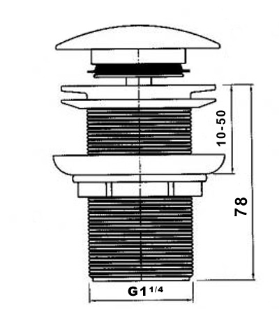 Korek wykonany z mosiądzu z okrągłym korkiem ozdobnym o średnicy 66mm. Korek jest wypukły. Spust posiada zatrzaskowy mechanizm zamykający typy "klik-klak". Rozmiar gwintu przyłącza 1 ¼".