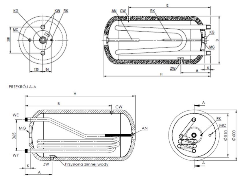 | AN | anoda magnezowa na korku 1¼" (dla WGJ-g 80-140) lub 2" (dla WGJ-g 160, 200 i 250) |