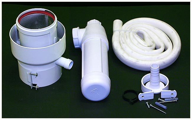 Przyłącze redukcyjne do kotła 60/100 mm na 80/125 mm ze zintegrowanym odpływem skroplin.