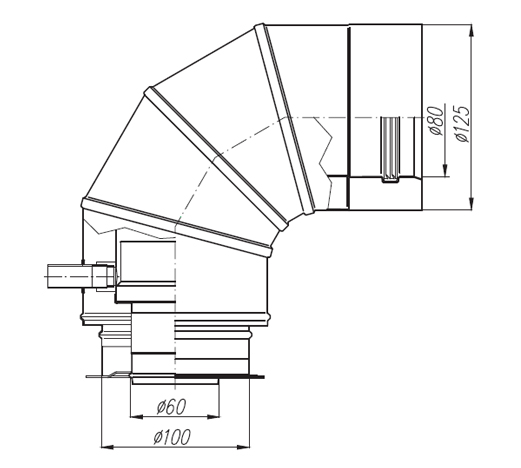 - kolano 90° z redukcją z wymiaru Ø60/100 na Ø80/125 wraz z odskraplaczem