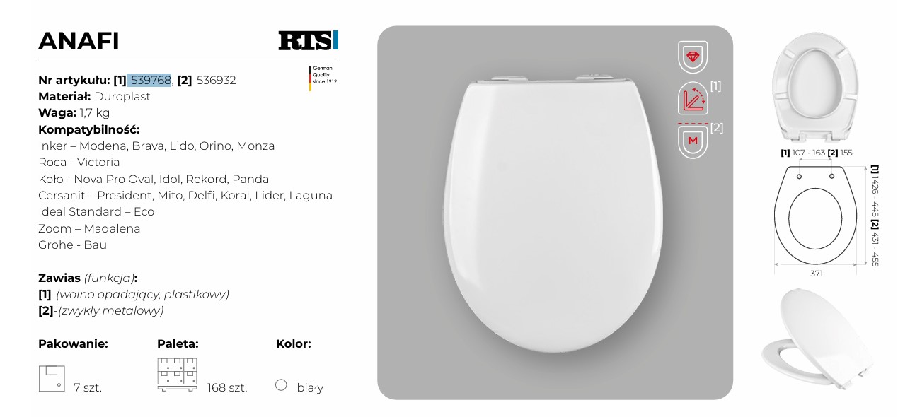 Deska sedesowa ANAFI, klasy PREMIUM, firmy RTS ROYAL TOILET SEAT. Deska charakteryzuje się wysoką odpornością na odkształcanie, oraz zarysowania. Plastikowe zawiasy. Woolnoopadająca. Wykonana z duroplastu, bardzo twarda! 2 lata gwarancji.