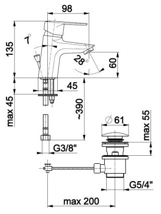 Bateria, spust sterowany metalowy 5/4" kpl. z cięgnem -1 szt. komplet mocujący z podstawką, przyłącza elastyczne M10x1/G3/8 L=350 mm, kluczyk do perlatora, instrukcja obsługi i montażu bat. jednouchwytowych stojących.