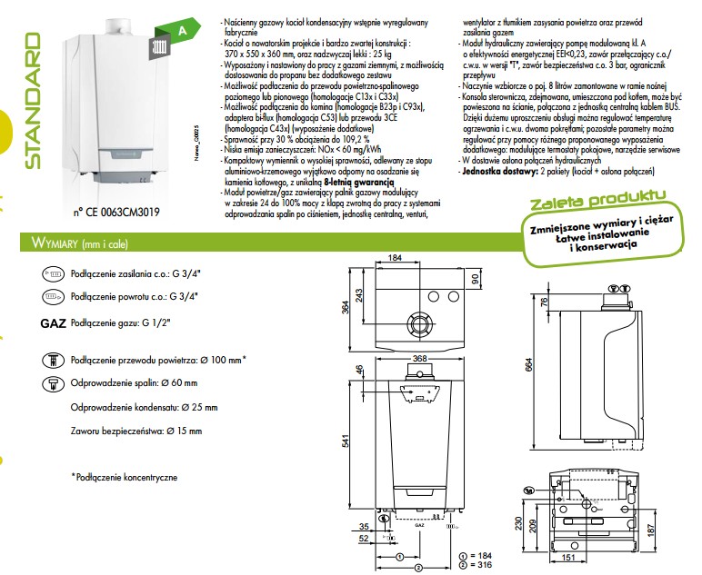 - Naścienny gazowy kocioł kondensacyjny wstępnie wyregulowany fabrycznie