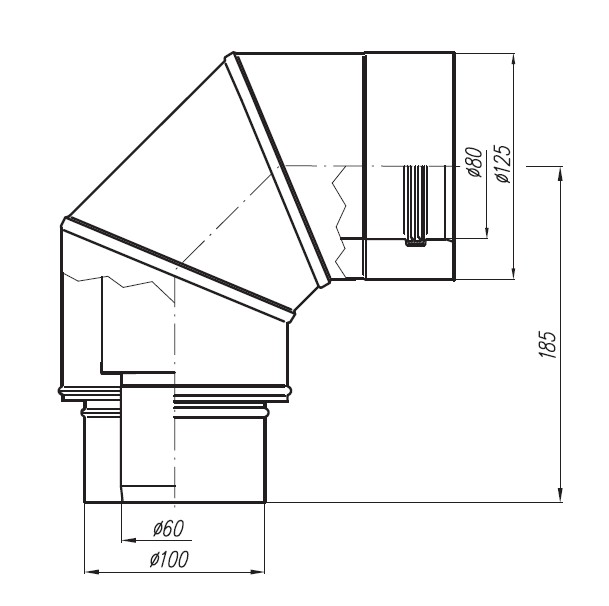 - kolanko 90° kolano z redukcją z wymiaru Ø60/100 na Ø80/125,