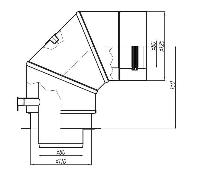 - kolano 90° z redukcją z wymiaru Ø80/110 na Ø80/125 mm,