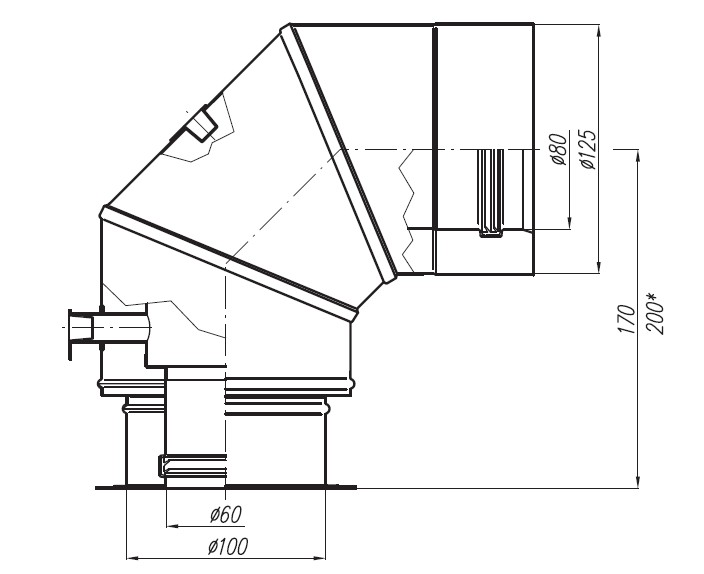 - kolano 90° z redukcją z wymiaru Ø60/100 na Ø80/125,