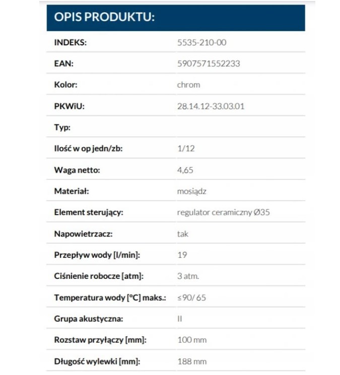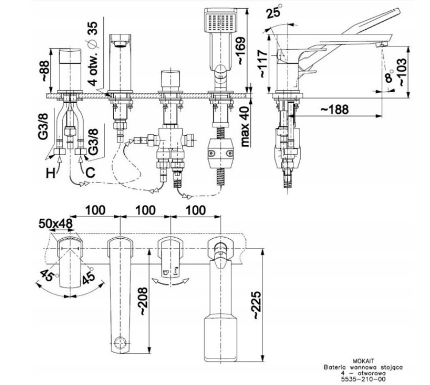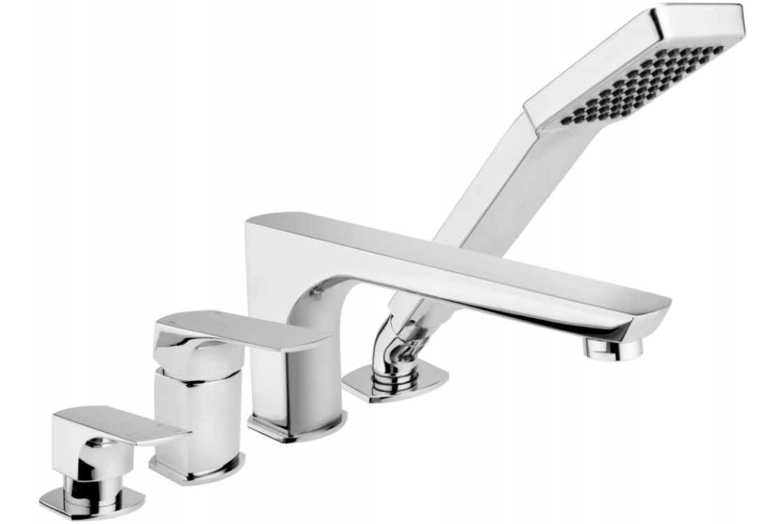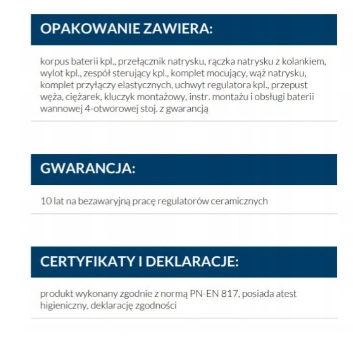 korpus baterii kpl., przełącznik natrysku, rączka natrysku z kolankiem, wylot kpl., zespół sterujący kpl., komplet mocujący, wąż natrysku, komplet przyłączy elastycznych, uchwyt regulatora kpl., przepust węża, ciężarek, kluczyk montażowy, instr. montażu i obsługi baterii wannowej 4-otworowej stoj. z gwarancją