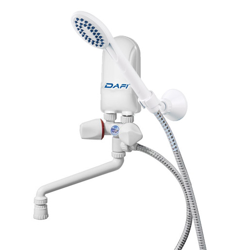 Na zdjęciu pokazano podgrzewacz wraz z podłączonym zestawem prysznicowym.