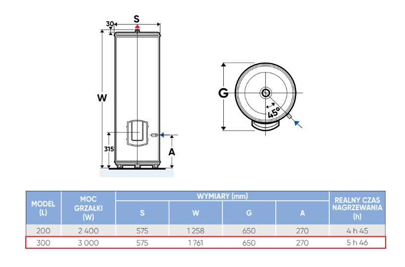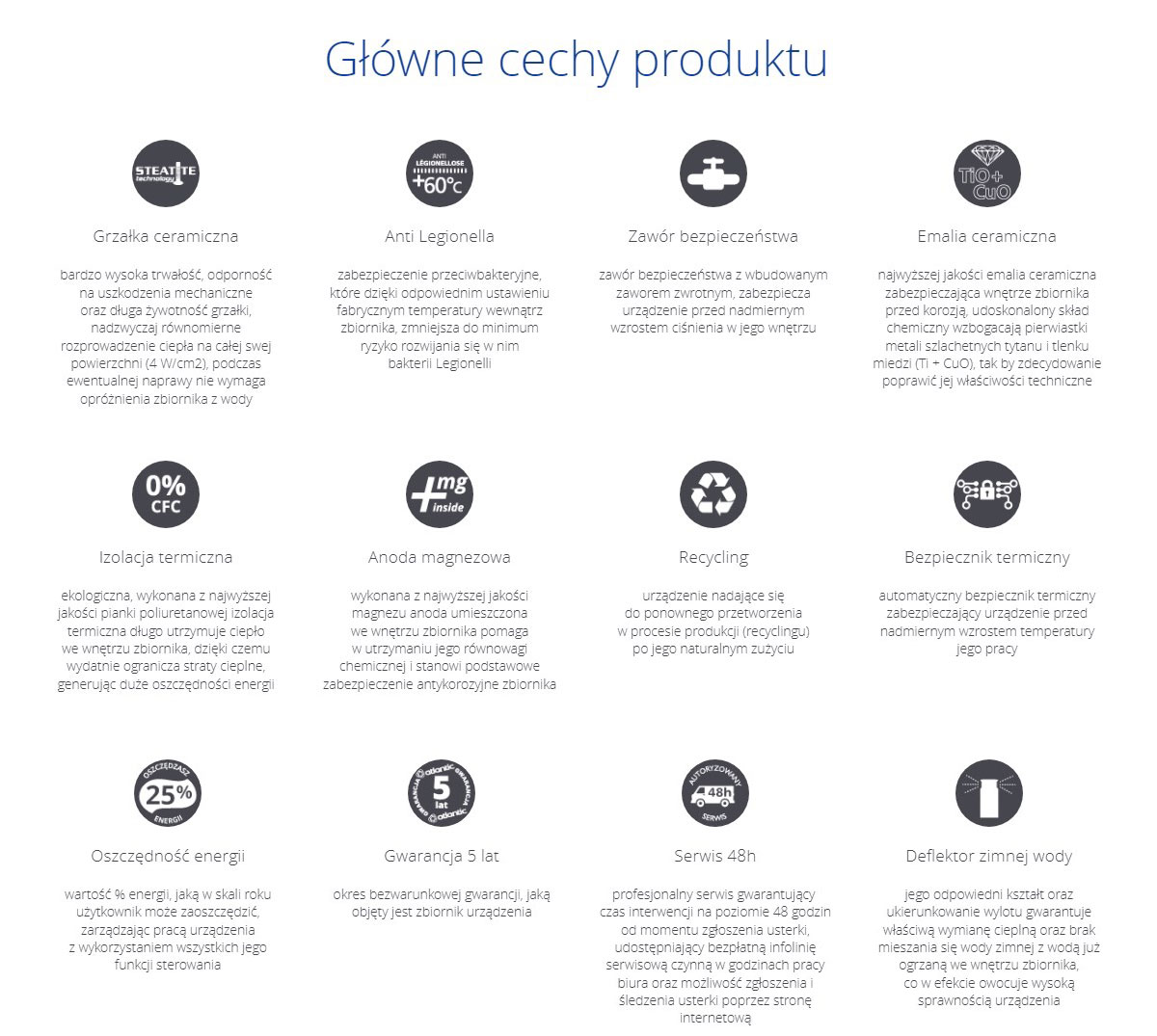 Jego parametry techniczne i duża pojemność gwarantują dużą wydajność oraz akumulację ciepłej wody w domu, biurze czy małej firmie.