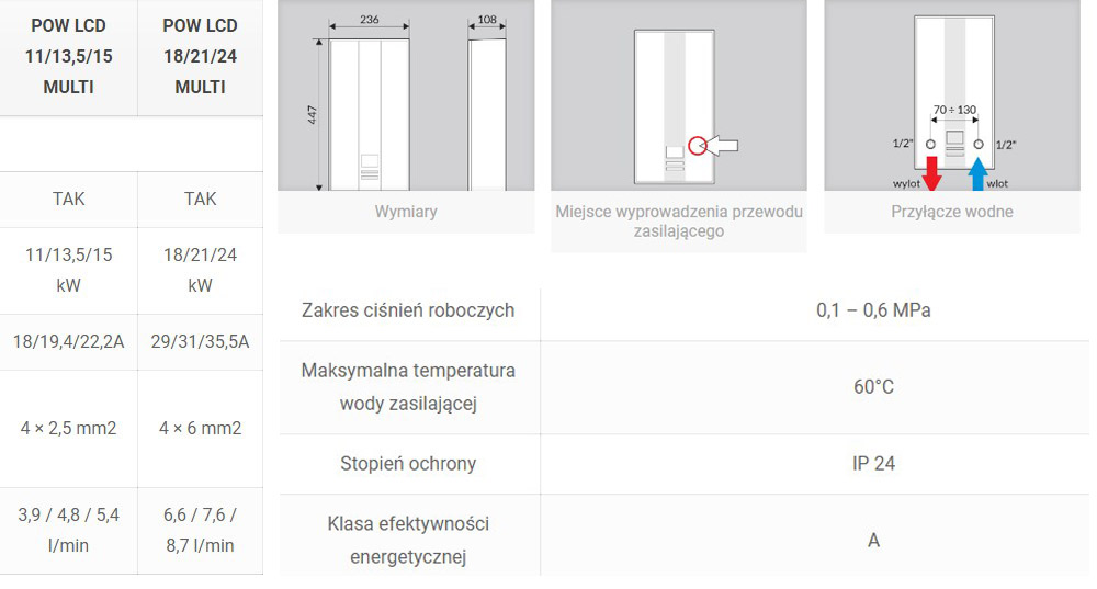 Przepływowe ogrzewacze POW-LCD oraz POW-LCD MULTI o mocy 18/21/24 kW