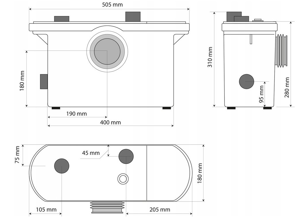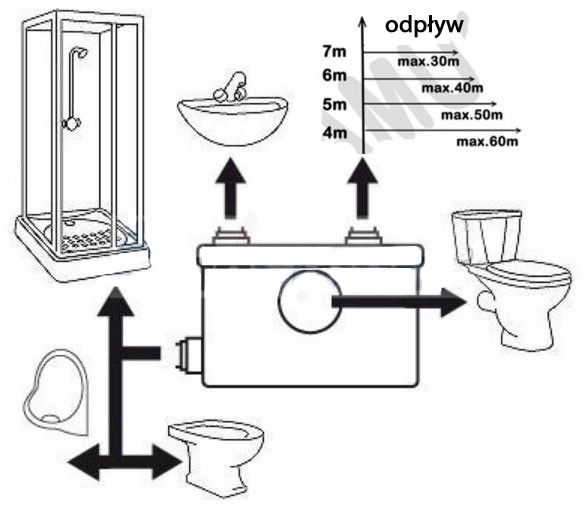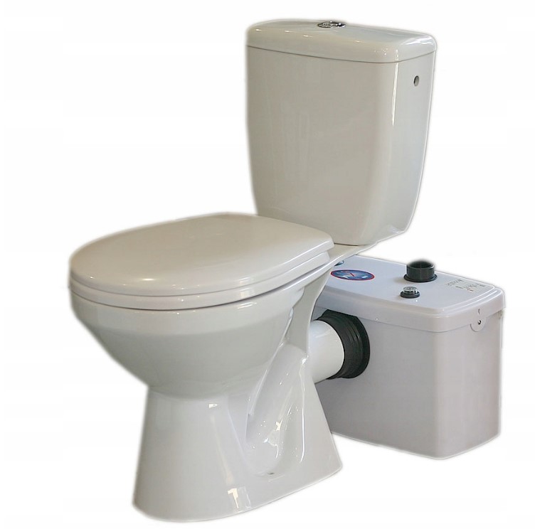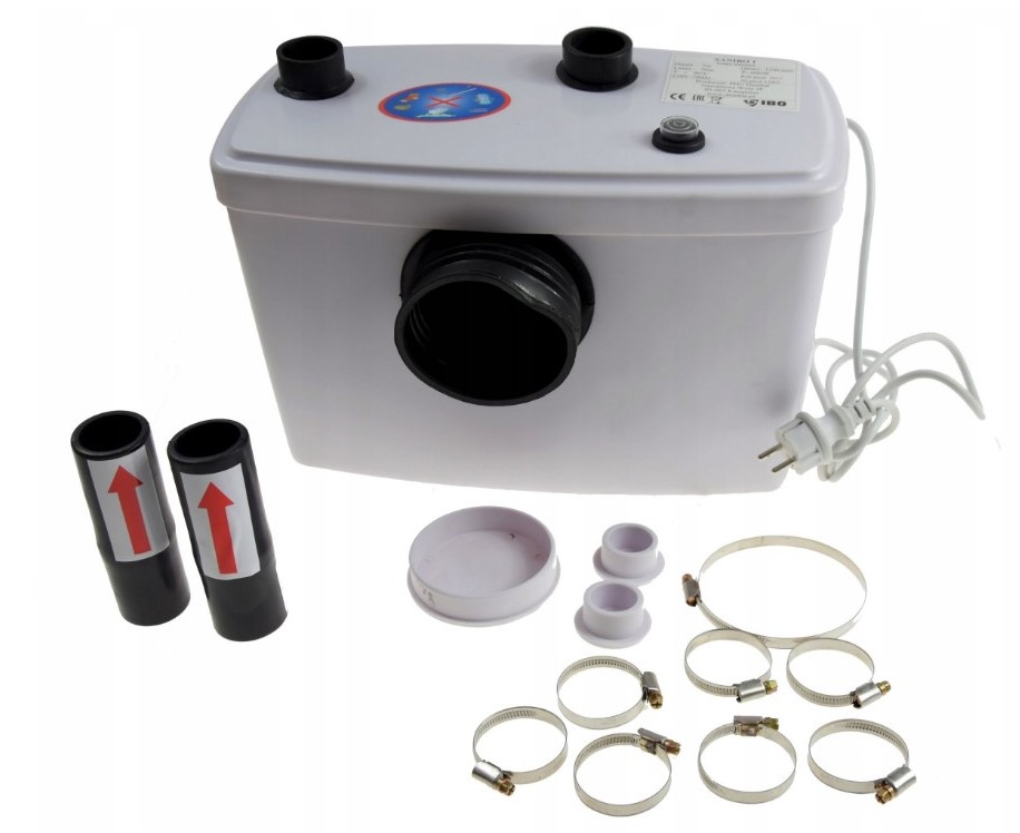 Przepompownia toaletowa służąca do przetłaczania ścieków wszędzie tam gdzie toaleta znajduje się w dużej odległości od pionu kanalizacyjnego lub znajduje się poniżej poziomu tzw. cofki. Przepompownia uniwersalna, może być stosowana w toalecie jak i po zaślepieniu wejścia na sedes w pralni lub kuchni. Dwa wejścia na dowolne urządzenia typu umywalka, pralka, prysznic, wanna + wejście WC