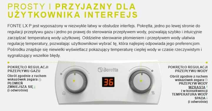 FONTE LX P jest częścią linii produktów Beretta o niskiej emisji NOx, oferując doskonały komfort sanitarny i zgodność z najnowszymi dyrektywami europejskimi dotyczącymi redukcji emisji. FONTE LX P jest dostępny z wydajnością 11 litrów/min*, zarówno w wersji na gaz ziemny, jak i LPG. Łatwość instalacji i konserwacji w połączeniu z intuicyjną obsługą sprawiają, że jest to idealny wybór do produkcji ciepłej wody użytkowej w domach.