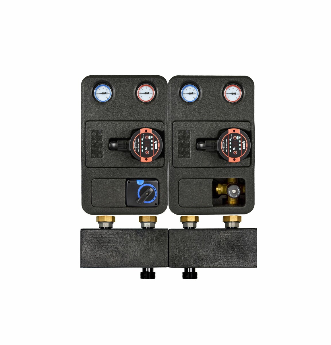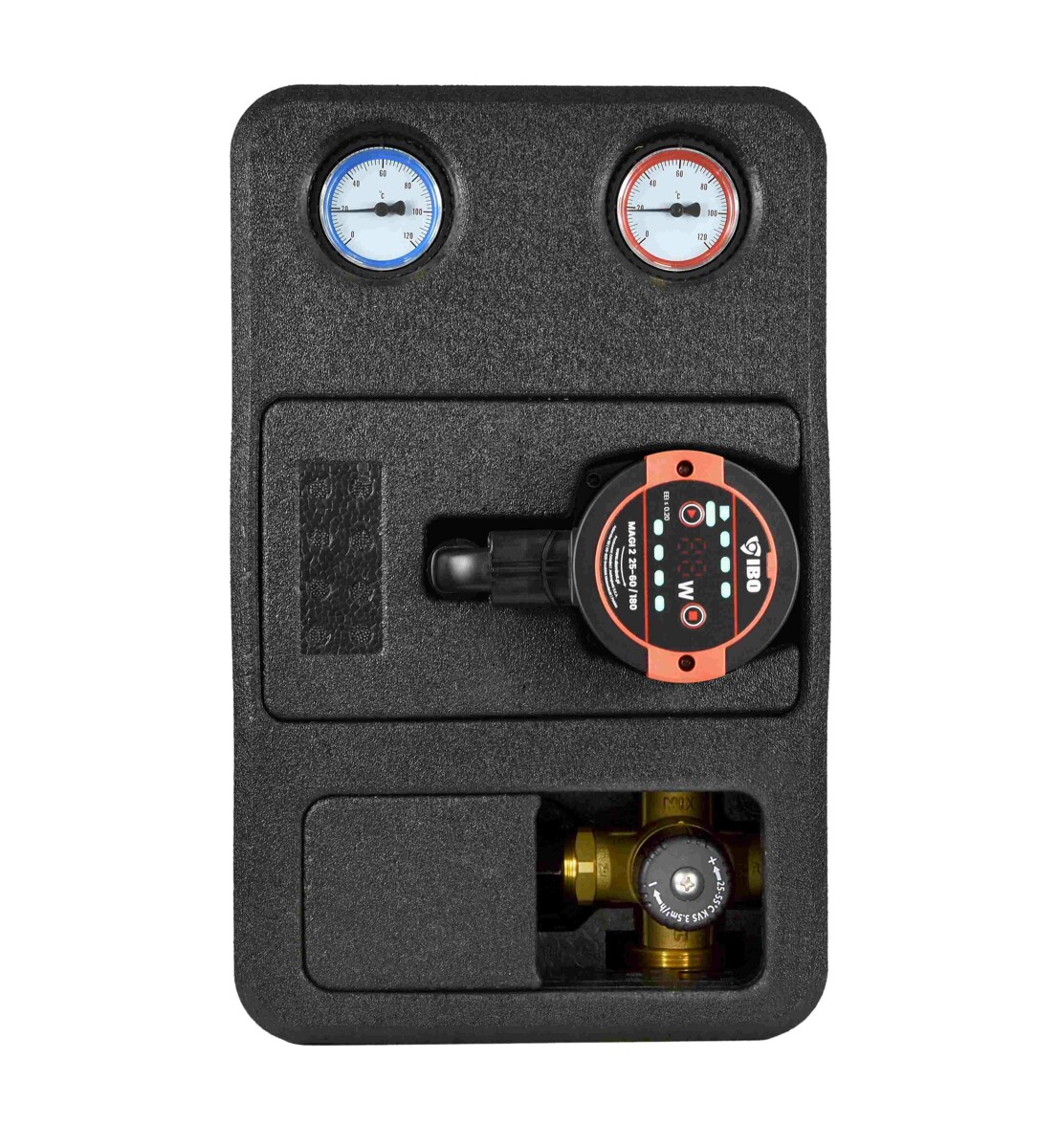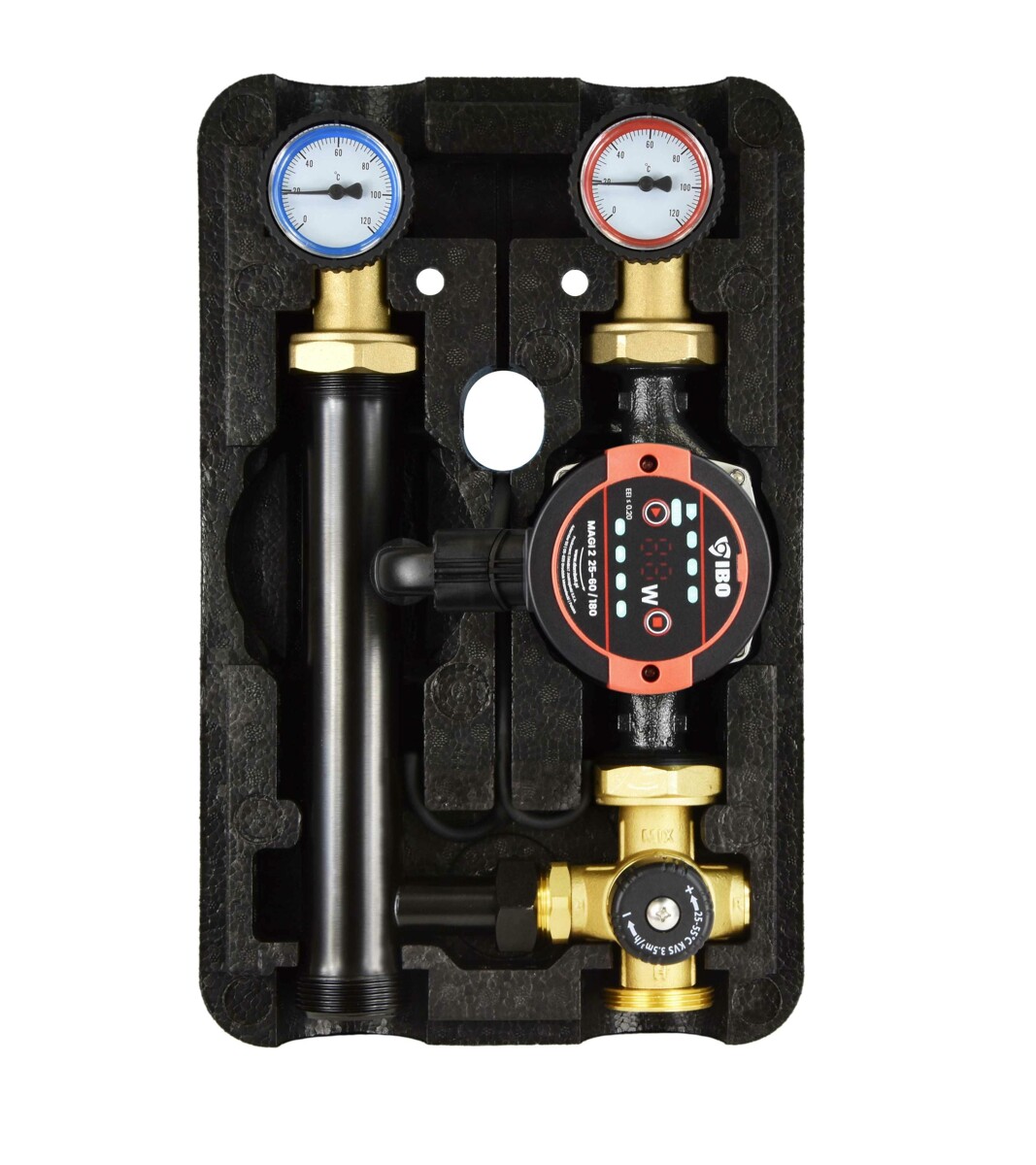 Grupa pompowa IBO GP PRO 3D-T z obiegiem wyposażonym w zawór trójdrogowy termostatyczny, zalecana jest do stosowania w instalacjach w których zachodzi potrzeba zmiany temperatury czynnika, który ma być przekazywany do odbiornika. Grupa z zaworem termostatycznym umożliwia sterowanie temperaturą poprzez nastawę ręczną temperatury.
