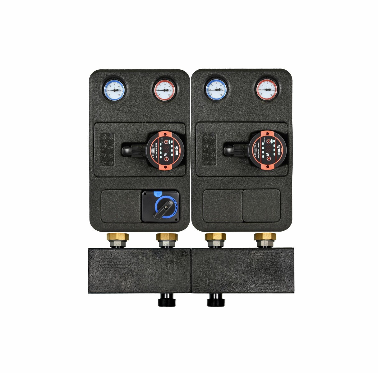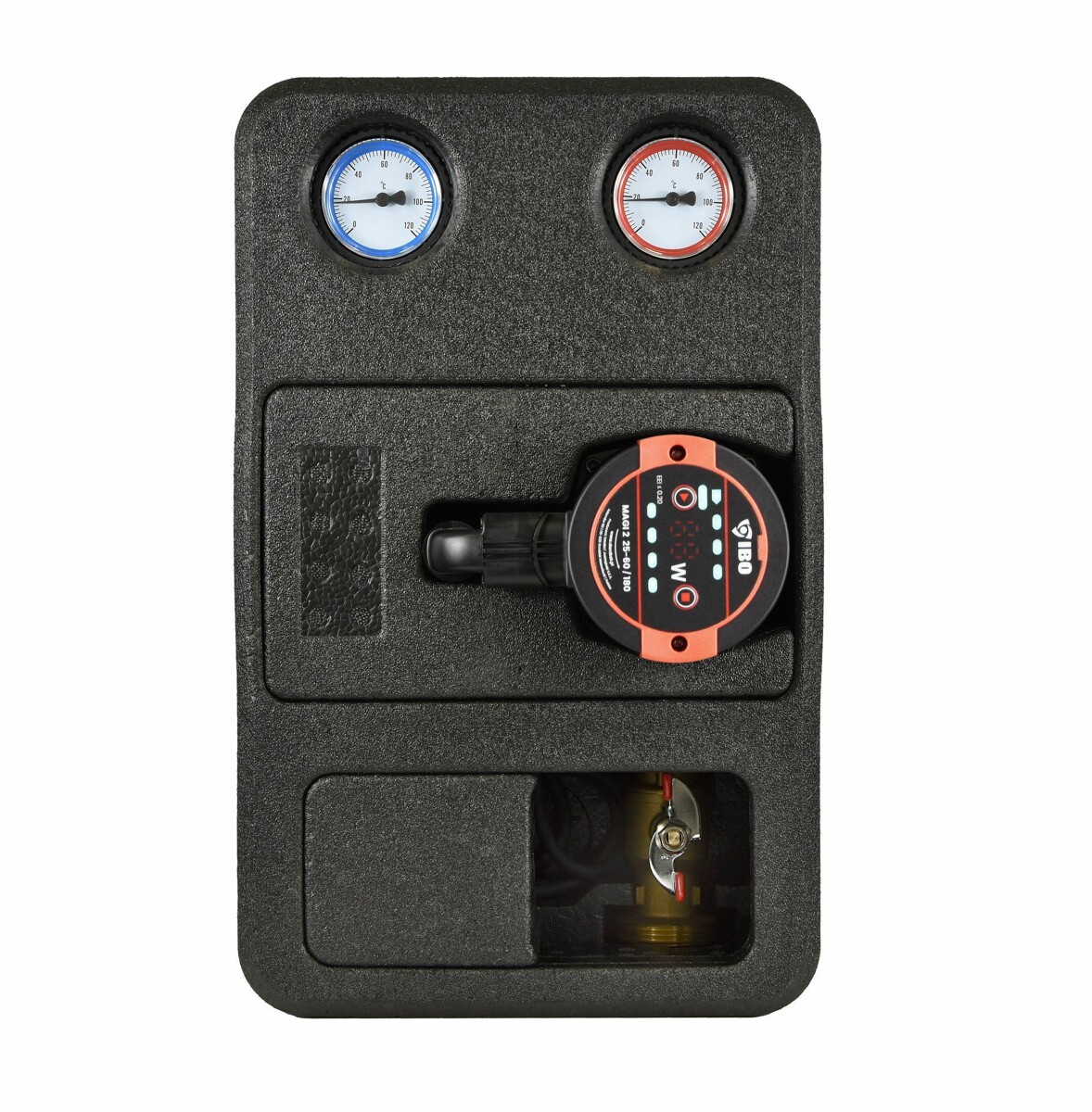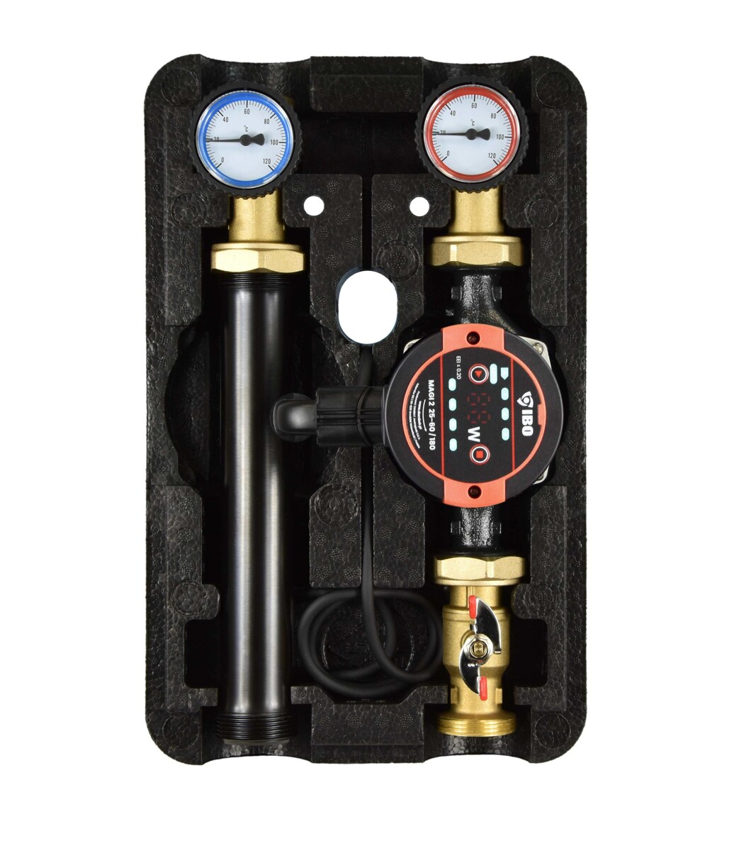 Grupy te wyposażone są w izolację termiczną, która zapobiega wychładzaniu systemu, oraz kompaktowe przyłącza, ułatwiające pracę instalatora. Rozstaw odpowiadający grupom IBO GP PRO wynosi 25-xx/180.