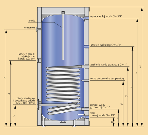 Duża wydajność wymiennika : Wężownica o dużej powierzchni wymiany ciepła, sięgająca do samego dna zbiornika zapewnia szybki czas podgrzewania i równomierny rozkład temperatury wody w całej objętości wymiennika.