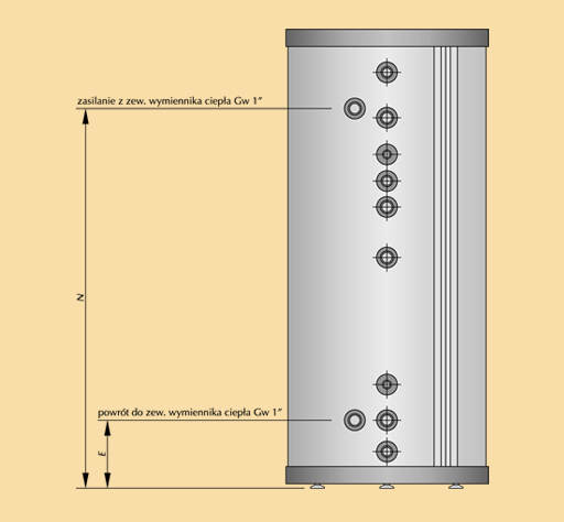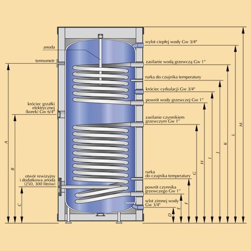 Duża wydajność wymiennika : Wężownica o dużej powierzchni wymiany ciepła, sięgająca do samego dna zbiornika zapewnia szybki czas podgrzewania i równomierny rozkład temperatury wody w całej objętości wymiennika.